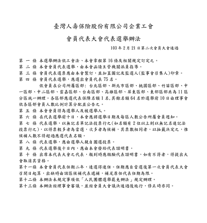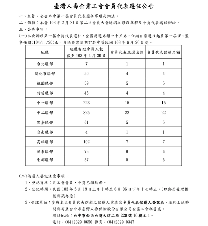 臺灣人壽企業工會會員代表選任公告